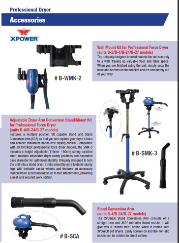 The XPOWER Stand Conversion Arm consists of a straight arm and 360° rotatable flexed nozzle. It will give you a “hands free” option when it comes with XPOWER pet dryers. Easily screws on and the non-slip nozzle can be rotated to direct airflow.