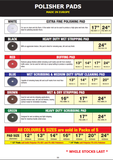 Restores glossy finishes whilst removing scuff marks and dirt from medium traffic areas. Can be used for both dry or spray buffing to produce a sparkling shine. Regular speed pad.