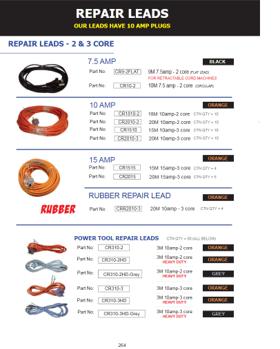 CLEANSTAR – POWER TOOL REPAIR LEADS (9M 7.5AMP 2CORE FLAT)