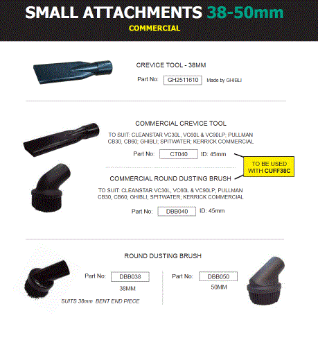 - Suits vacuum cleaners that use 50mm tools and accessories