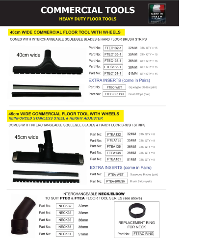- 45cm wide commercial floor tools (FTEA range) with interchangable squeegee blades and hard floor brush inserts