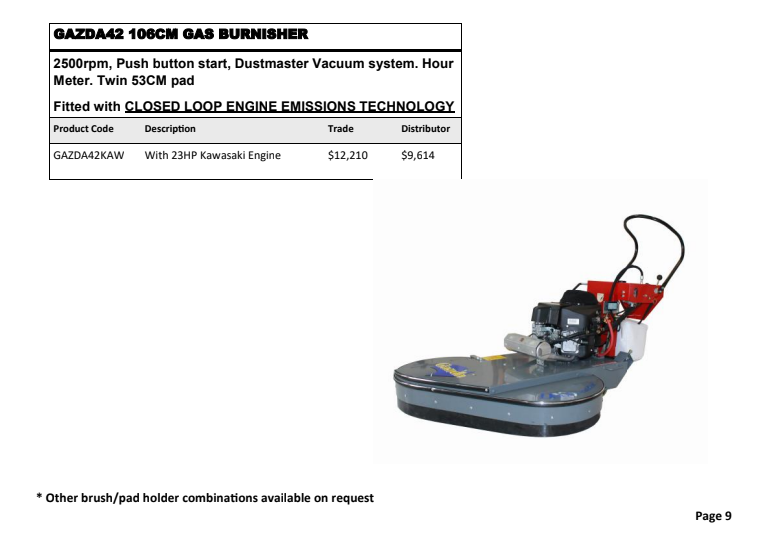 The new Gazda 42 floor burnisher is the worlds largest, delivering unsurpassed productivity, yet as easy to use as a single pad machine. Variable pad pressure allows the machine to be tuned for best results on any brand of floor polish. Fitted with the new Closed Loop Engine Emission technology, it automatically ensures that CO emissions are minimised and maintained at safe levels, below the workplace exposure standard determined by Safe Work Australia. Along with Gazdas reputation for performance and reliability, you get 2 fully independent 53cm pad drives* with Gazdas patented pressure balancing system to guarantee both pads are always in full contact with the floor regardless of undulations. Its user friendly design makes it as easy to use as a single pad machine, ensuring maximum productivity throughout the shift. All-Australian designed and built.