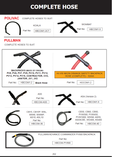 - Single 1.8m long hose with machine end piece and 32mm hose handle