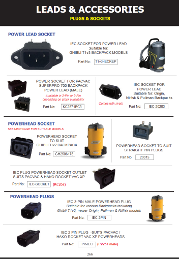 - Male 2 Pin IEC Power Socket for various backpack vacuum cleaners including some Nilfisk, Origin and Pullman