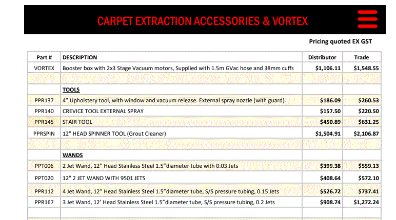 A carpet cleaning wand crafted for superior performance, featuring a unique 2-jet design. Its integrated side splash guards keep overspray in check. Experience optimal vacuum flow and unwavering durability thanks to the overlapped weld head to vacuum tube construction. The advanced control valve boasts a ‘soft opening’ feature, while the stress-free oval aluminium grip guarantees comfort. It is built to last with stainless steel solution tube, brass angle valve, and precision nozzles. Elevate your cleaning game with this 12” head width, double-bend wand offering full-flow vacuum extraction. It’s the ultimate tool for detail cleaning on hard surfaces