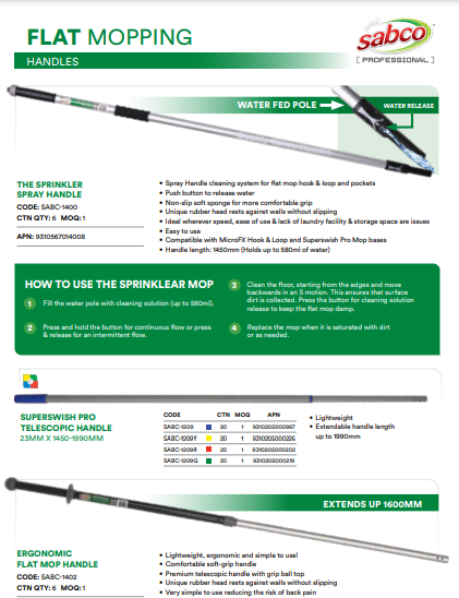 Sabco Professional offers a comprehensive range of high-quality products for commercial and professional use. Our dedication to excellence is evident, in particular in our flat Mopping Handles range, featuring the innovative SuperSwish Pro Telescopic Handle. This dedication ensures durability, reliability, and exceptional performance.