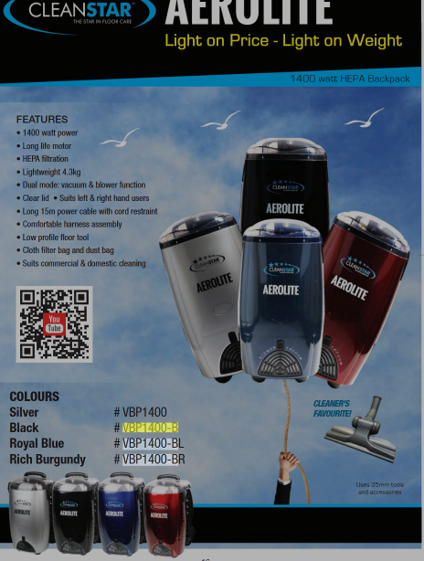 CLEANSTAR AEROLITE 1400 WATT BACKPACK-BLACK